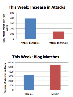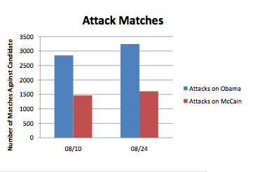 What is behind McCain’s surge? One factor is negative attacks on Obama, such as the Paris Hilton ad or John Corsi’s propaganda book. Over the past two weeks there have been twice as many attacks on Obama’s positions than on McCain’s, and those attacks were seen 2.8 million times so far in August versus 1.1 million views for attacks on McCain. (Attributor’s technology can identify negative or positive words). And it is not just the traditional news media that is eating up the attacks. Bloggers love them too. As the attacks have increased, so have blog matches citing McCain’s positions. In the past week, 350 new bloggers wrote about McCain’s views, marking the first time that McCain gained more new blog coverage than Obama (who picked up about 250 new bloggers). Going negative works.
