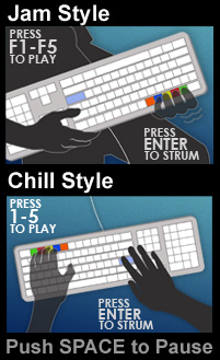 Once you sign up, you pick a song from a variety of genres (although right now there are only songs in rock, alternative, and acoustic) and a difficulty level. Once the song starts playing, notes come down as dots on a guitar fret, and you have to press the right buttons on your keyboard and “enter” as they pass by. You can play “Jam Style,” holding your keyboard like an air guitar, or “chill style” (see illustration.). I’d recommend chill style—you never know who might walk into the room and catch you geek rocking with your keyboard. The game will will also support game guitars plugged into our computer for serious faux fretters.