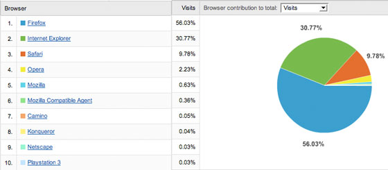 Google Analytics, which is what we use at TechCrunch, doesn’t track Chrome usage yet (we’ll see tomorrow after the delay period ends). But our users have never been very representative of the Internet as a whole anyway. 56% of TechCrunch readers from the last 30 days use Firefox, compared to 31% for Internet Explorer and 10% for Safari. Full TechCrunch stats below: