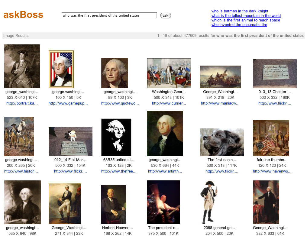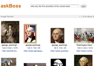 Built by a Yahoo employee, askBOSS is like Powerset for images. It processes natural language (i.e. “who was the first president of the United States?”) and returns images that are intended to “answer” your query.