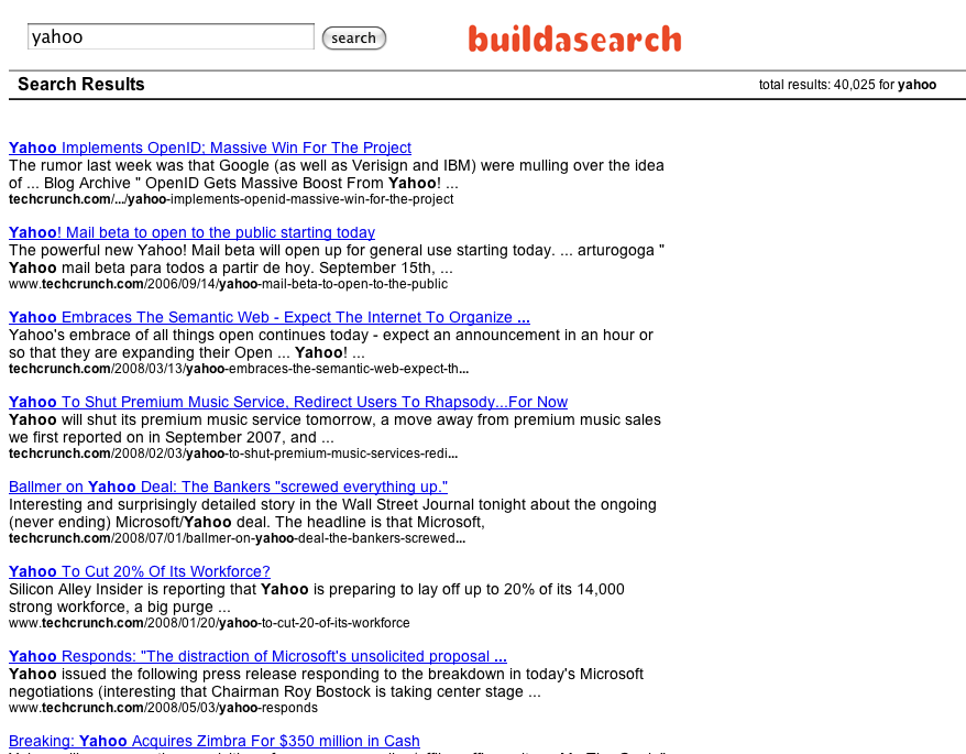 It took me a a grand total of 30 seconds to set up site-specific search for TechCrunch, found here. Unfortunately, our logo only shows up on the first page so the engine isn’t truly white-labeled.