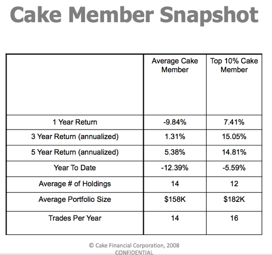 But how good are Cake’s top 10 percent beyond what is goes into the Cakedex? The average Cake member’s portfolio is down 9.84 percent over the past 12 months, while that of the average top-ten-percenter is up 7.41 percent. (YTD it is -12.39 percent versus -5.59 percent, respectively). So not bad. Maybe there is some wisdom in this crowd. Here are comparisons for other time periods: