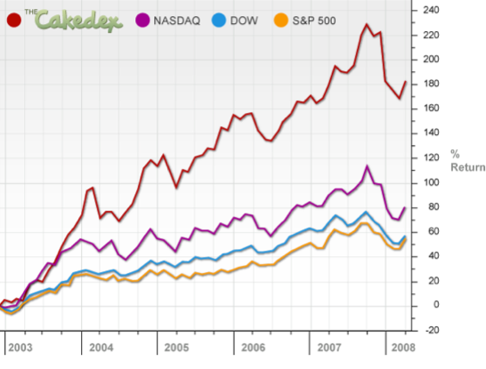 One year after it launched at TechCrunch40, Cake Financial is rolling out a new design today with a load of new features. One of the most interesting is a new stock index called the Cakedex that is based on the top 100 holdings of the top performing investors on the social investing site. Over the past five and half years, the Cakedex would have outperformed the S&P 500, the Dow Jones, and the Nasdaq. Although, over the past 90 days, it has been underperforming the major stock indexes. Next year, the company plans to launch an exchange-traded fund based on the Cakedex so that people can actually invest in it. Can the top investors on Cake do better than the market?
