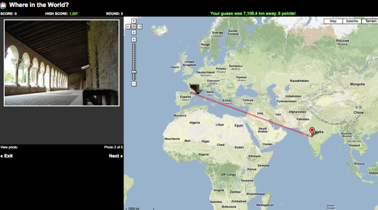 The Picasa Explore page also has a Where In The World? game that is mashup opf geotagged photos and Google Maps. It shows you a photo and you have to guess where it was taken. If you guess wrong, it tells you how far off you are in kilometers. This is fun for outdoor photos, but when people upload geotagged photos of a generic apartment of a plate of food, it can become tricky.
