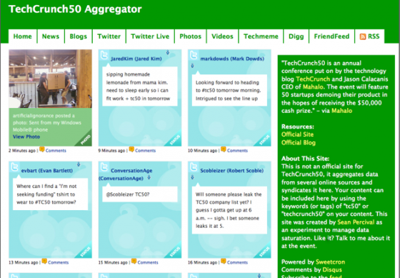 I know where I am going to be checking to see what people are saying about TechCrunch50 this week. The TechCrunch50 Aggregator. It is a site developed by Sean Percival to collect all the Twitters, FriendFeed comments, blog posts, news stories, photos, videos, Diggs,and Techmeme headlines that are tagged “techcrunch50″or “tc50.”