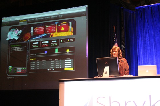 Co-founder Shane Kimpton presented how a mythical 8 year old girl “Lacy” would log into iThryv. Lacy has a savings account, 28 bucks in savings and a checking account. The savings are from her parents, desposited to teach her about credit and savings. She “wants” a Barbie Corvette toy and it lists it on her wish list along side her actual spending on recent purchases like toys. She works out she spent 50% on “wants” and 25% on “needs” which turns out not to be a good ratio for good money management. So on the manage money section she works out how to spend her money better.