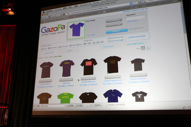 Gazopa’s big idea is to render keywords obsolete when it comes to image search. Instead of typing search terms, Gazopa’s visual engine lets users upload their own images or right-click on ones found on any webpage. Project leader Hideki Kobayashi used a handbag on a shopping site as an example. In case you like the general shape or color of the handbag but want to see others with similar designs, Gazopa matches the pattern without relying on any of the metadata associated with the images.