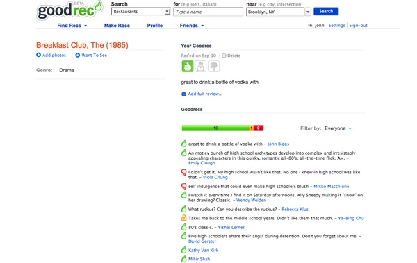 GoodRec is a web-based system for posting and finding recommendations from your friends and the world at large. The recommendations pop up on a map either in the browser or on a phone – specifically, in this case, the iPhone.