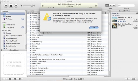 Like, check this out. I tell Genius to make a playlist based on “Energy Bomb (Alex Gold, Adam K & Soha Mix)” by Alex Gold, a progressive house song (you can listen to it here, if you dare!). What does Genius do? It makes a playlist of a bunch of progressive house songs. (That’s when it doesn’t throw me a bunch of error messages.) Wow, thanks. I couldn’t have done that on my own.