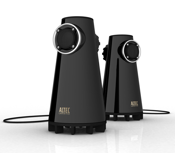 Huh? 2.2? Yup. Each of those ominous-looking speakers has a 4” subwoofer pointing straight down. Standing at 10” high, the Altec Lansing Expressionist BASS (FX3022) system is designed to be used on a tabletop, which would then radiate sound. The inclusion of the subwoofer into the normal form factor eliminates the need for a third bass-amplifying component.