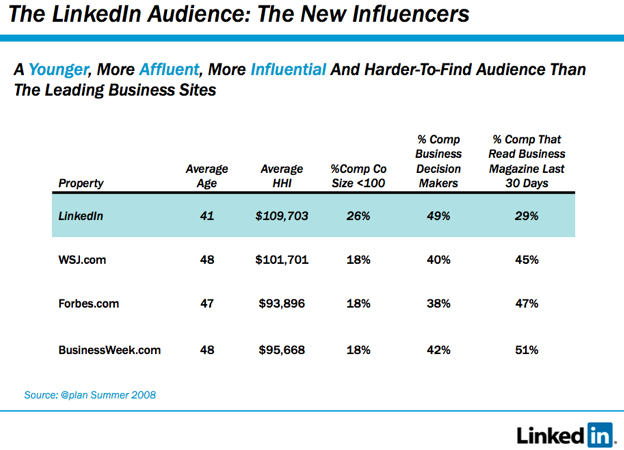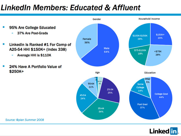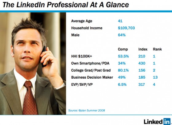 LinkedIn claims 27 million registered users. According to comScore, 5.2 million from the U.S. visited the site in July (8.7 million worldwide). LinkedIn claims that the average household income of its members is $110,000, 64 percent are male, the average age is 41, and 49 percent are decision makers. (In contrast, the average Wall Street Journal reader, according to LinkedIn, makes $102,000 per household, is 48 years old, and only 40 percent are business decision makers).