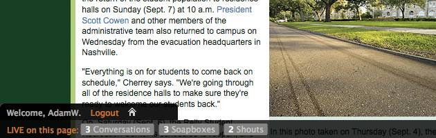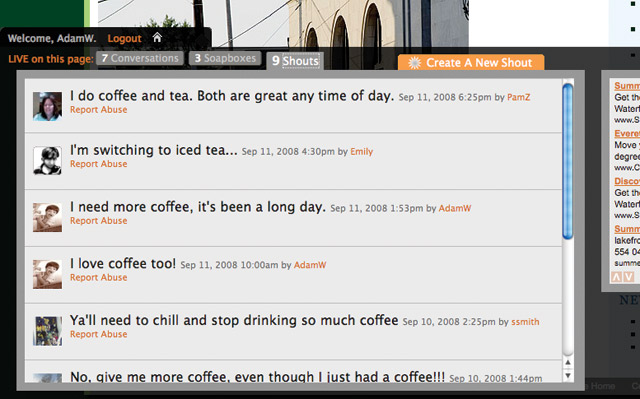 Conversations are essentially lightweight forum threads where users can post messages and solicit responses. Soapboxes are akin to blog posts and Shouts are like tweets in that they’re restricted to 140 characters. In the LiveBar’s simplest implementation, these pieces of UGC are associated with individual URLs, so when you move from one page to the next, you see different content.