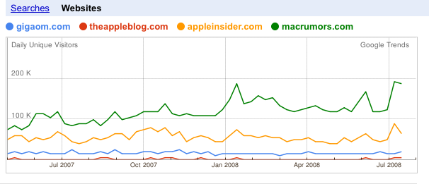 Terms were not disclosed, but it is unlikely he paid much for TheAppleBlog. It attracts much less traffic than some of the better known Apple blogs, such as AppleInsider or MacRumors. In fact, some the Apple-only blogs bring in more visitors than GigaOm (see chart above; GigaOm is in blue, TheAppleBlog is in red). If Om can help TheAppleBlog compete at the same level, it could have a huge impact on his business. Smart move.