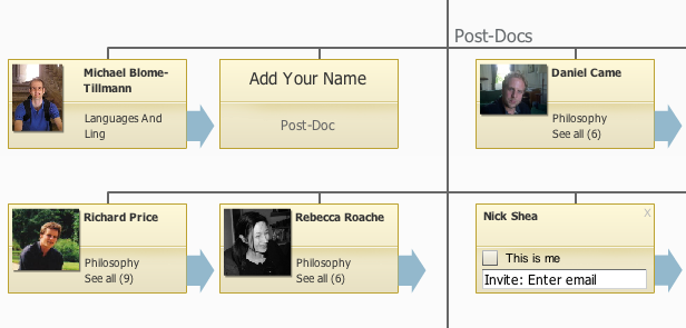 At first glance the site bears a strong resemblance to Geni, the genealogical site that visually maps relationships between people. Professors, post docs, and graduate students are displayed according to their department and the professors they work under, as well as their specific fields of study. In the future, the site will also map which members have worked with each other on past research projects.