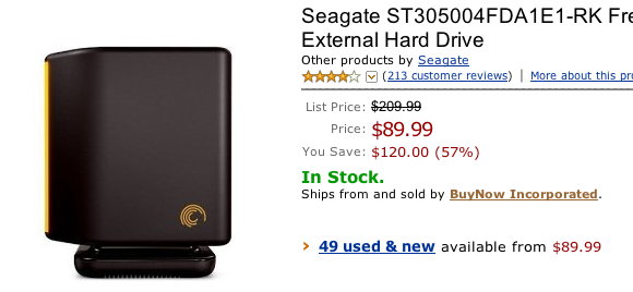 You can get a half a terabyte Seagate external hard drive for only $89 and when you throw in shipping, for less than a bill. Come on, that’s not bad. Ships from BuyNow Incorporated through Amazon, but the company is rock’n five stars with 12,803 ratings. Not too shabby at all.