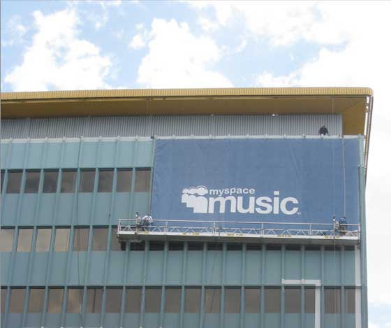 The first two images above are mockups supplied by MySpace showing what the billboards will look like. The third and fourth are actual pictures of the LA billboard going up today that a reader took for us.