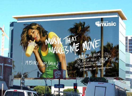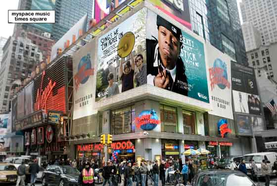 It sure looks like MySpace is spending a ton of cash on next week’s launch of the MySpace Music joint venture with the major labels. The first advertising blitz hits Los Angeles (Hollywood on Sunset) and New York (Times Square). The billboards feature artists Lil Wayne, M.I.A., Jonas Brothers and others.