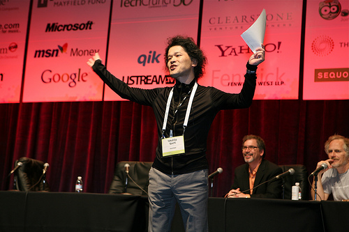 By far, the biggest crowd pleaser at last week’s TechCrunch50 was a demo by the Japanese startup Tonchidot for a mobile social tagging product it is developing called Sekai Camera. The Japanese CEO Takahito Iguchi overcame a very noticeable language barrier and deflected serious questions from the judges through sheer will of character. He had the audience roaring in laughter and rooting for him, as he answered lengthy questions about how his service would actually work with brief responses such as “Imagination!” and “We have a patent.” When judge Rafe Needleman suggested that Google would buy Tonchidot, he objected: “Never!”