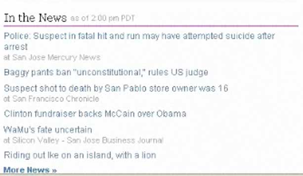 The first is integration of news items on the home page from third party sources. Today all news sources in the “In The News” section point to internal Yahoo news pages. But the internal prototype shows links to outside sources like the San Jose Mercury News and the San Francisco Chronicle. Whenever this launches, look for massive butt-kissing by media to get themselves on the home page.