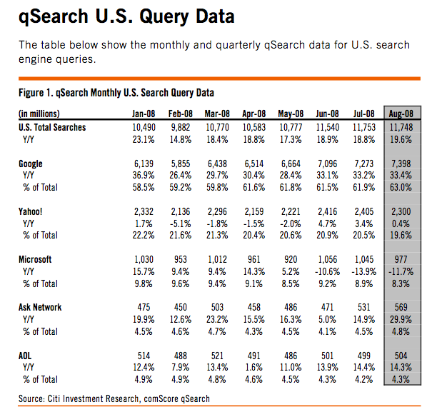 Not that Microsoft is doing much better. Its U.S. search share fell from 8.9 percent to 8.3 percent. Its Live Search Cashback promotion, which accounted for only 8 percent of its searches in August (78 million out of 977 million total search queries), is still not helping stem its decline.