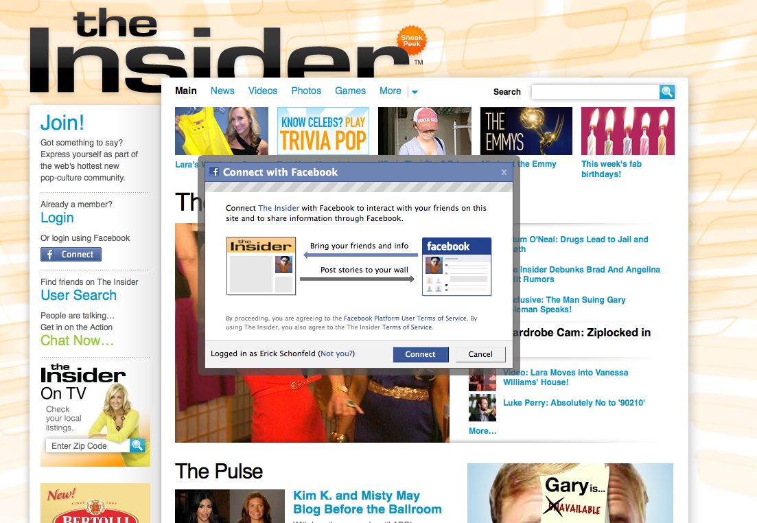 Your Facebook ID is about to be accepted at a whole lot more sites than just Facebook. Developers have been hacking away with Facebook Connect since last May, and now partner sites are getting ready to launch. CBS’s celebrity gossip site TheInsider is the first to do so. Anyone can log in using their Facebook ID, and then can choose to have any comments, article votes, or poll responses show up in their Facebook feed.