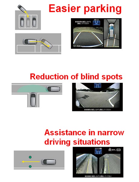 The system consists of a total of four wide-angle CCD cameras that are installed in the front and rear of the cars and on the right and left door mirrors. Drivers will see synthesized images on the navigation system’s screen, along with additional visual information such as projection and reference lines for making it easier to assess distances and view the cars’ projected trajectories.