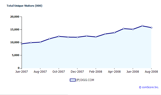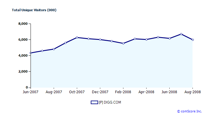 Digg claims 30 million monthly unique users. ComScore, however, counts 15.8 million uniques worldwide as of August, and 6 million in the U.S., both of which were down from July. (Quantcast shows 21.4 million global uniques, and 11.4 million U.S.). At least in the U.S., Digg’s traffic seems to be flattening. So you can see why the company wants to emphasize global expansion. Here is a chart of its U.S. traffic: