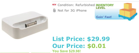 Note: this dock will not work with the Apple iPhone 3G, only the original, flat-backed version. So if you happen to want another dock for your cube or gf’s house, $5 shipped isn’t a bad deal. It comes via Today’s Closeout, so just like Woot, this deal is only ’till they last or the clock strikes midnight.