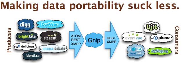 Data consumers can get complete public data streams for Twitter, Digg, Delicious, Six Apart and others without ever visiting those sites or accessing their individual APIs, subject only to the terms of service of those services. And this data can be gathered via a REST-based API or the newly launched XMPP support.