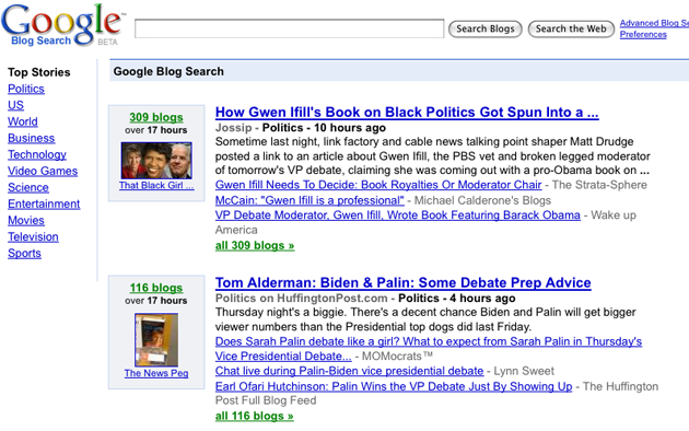 Google has just launched a new homepage for its blog search that bears a strong resemblance to Techmeme, Memeorandum and their “memetracker” counterparts. The site displays a listing of the top stories from across a variety of topics including business, politics, technology, and entertainment.