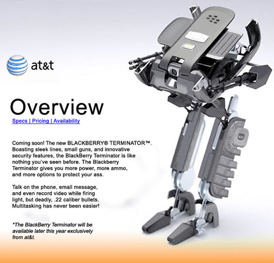 Yeah I know that’s from Robocop, not Terminator, but the latest BlackBerry device, the Terminator, looks more like ED-209 than a hunter-killer. It’s got all the usual stuff — infra-red vision, dual low-caliber guns, video recording, 3.5G. The keyboard looks a little awkward to operate when it’s in combat mode, but I think RIM probably knows what they’re doing. It’s strictly AT&T of course, but I don’t know if it’s quite deadly enough to switch carriers.