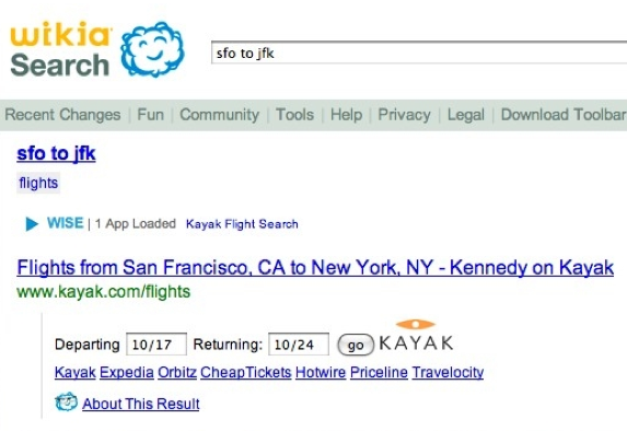 Wikia Search is launching the WISE framework with a bunch of partners: Digg (returns recent frontpage headlines as results), Indeed (for job search), Kayak (for travel searches), Last.fm (for music searches), and even Twitter (relevant Tweets). The other partners at launch will be AccuEather, AcronymFinder, Amie Street, Creative Commons (CC images), PleaseDressMe (T-shirt results) Thomson Reuters, Snooth (wine), and Yelp (local reviews). Partners can customize results not just for keywords, but create their own search apps. (Kayak’s, for instance, let’s you enter departing and returning dates when you search for a flight). So like Yahoo BOSS and Search Monkey, WISE lets developers change both the result ranking and the look and feel of customized results. In fact, anything that can be written in HTML can turn up as a result.