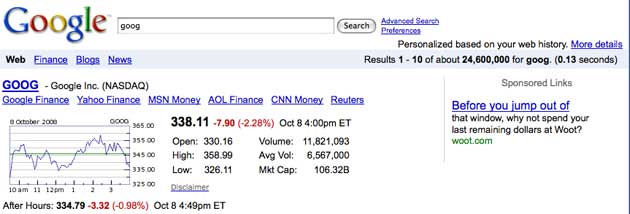 The advertisement on Google, which pops up on a search for “Goog” (Google’s Nasdaq symbol): “Before you jump out of that window, why not spend your last remaining dollars at Woot?” An alternative version: “Losing your House? Without that mortgage to pay, now you can buy more of our junk!”