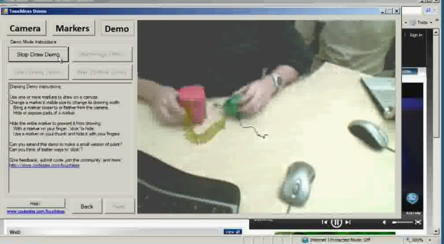Like Microsoft Surface and Touchwall, the Touchless software makes it possible to create applications that turn hand gestures and physical objects into an input device like a mouse. Touchless detects both the size and location of “color markers” (which can be fingers, toys, pens, M&Ms) as they move through space. Microsoft engineer Mike Wasserman s Ian Sands and Chris Pratley have created four demos to showcase the technology:
