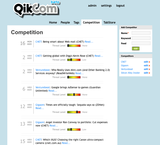 The competition tab lets you add the name of any competitor or product. QikCom then goes out to look for feeds from that competitor and populates that tab with the feed appropriate feed entries. Each entry has a rating slider that lets everyone on QikCom rate the threat level of each item. I tried it by typing in some blogs and news sites and it fetched the feeds instantly. It also finds mentions of competitors in news articles. Right now you can only rate each item, you can’t comment on them. And you can only see the competition feed in the competition tab. But commenting is coming soon, as is the option to make the competition feed show up on the home page. (It is in beta).