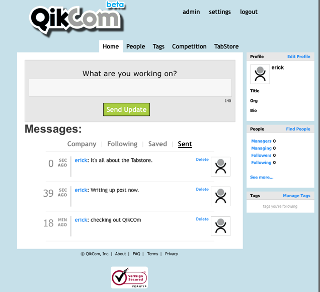 Yammer doesn’t have a TabStore, but it does a better job on basic messaging features such as the ability to send an update by SMS. You cannot do that yet with QikCom. (It is working on a a way to email in your updates, though). Yammer is also further along in creating an API