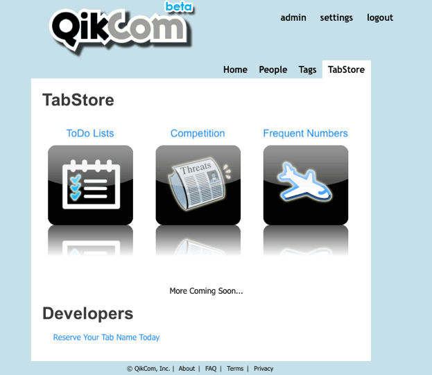 But the biggest twist is QikCom’s TabStore. It is modeled on Apple’s App Store for the iPhone. QikCom will keep adding features as new tabs, and allow other developers to do the same. At launch there are three free tabs in the TabStore that anyone can add: a To-Do list manager, a place to keep frequent numbers used across a company, and, my favorite, a competition tab.