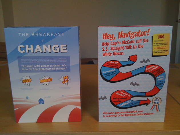 This week’s award for best marketing promotion related to the election goes to AirBed & Breakfast, the peer-to-peer pad crashing site for travelers. (You list how much per night you want for travelers to stay on your floor, and they book through the site). Today, I received a package from AirBed & Breakfast containing the two boxes of cereal pictured above: Obama O’s and Cap’n McCain’s. In addition to the physical boxes of cereal, there are two catchy jingles for each cereal (embedded below), and a Webpage where you can vote for the cereal you prefer.