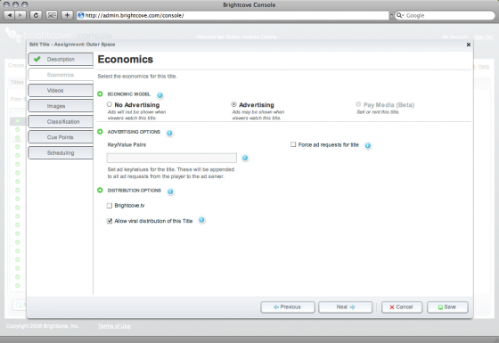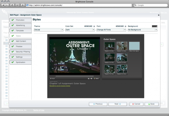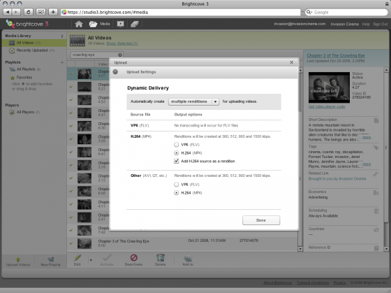 And, I think this might be new, Brightcove 3 will create “multiple renditions” of each video in different standards (VP6 and H.264) and different bit rates (360, 512, 900, and 1,500 kbps), depending, presumably, on the viewer’s bandwidth and software: