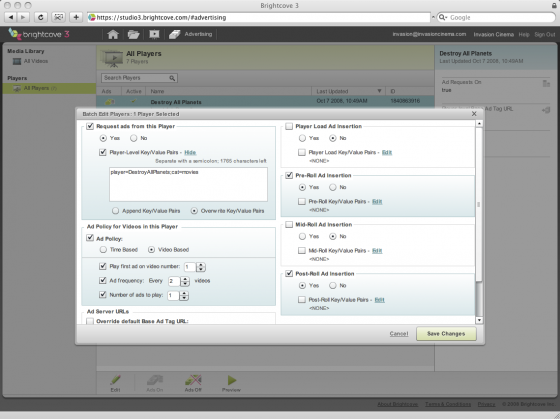 The advertising options are also being expanded. Brightcove 3 (top) looks like it will have options for different ad policies and ad types (pre-roll, mid-roll, post-roll) per player. Currently (bottom), users can pick “advertising” or “no advertising”: