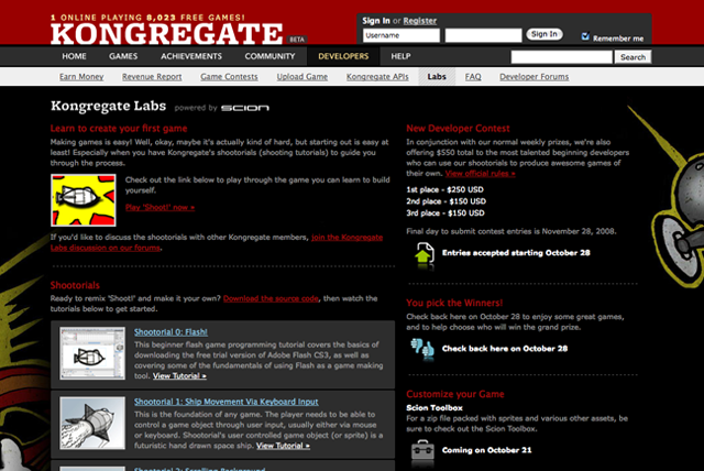The launch of Labs also marks Kongregate’s biggest advertising campaign to date, for Toyota’s Scion line of cars. Branding for Scion not only pervades the Labs section; the startup is also running a developer competition in which Scion is giving a few hundred dollars to the best sample spaceship game enhancements.