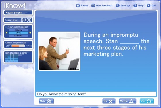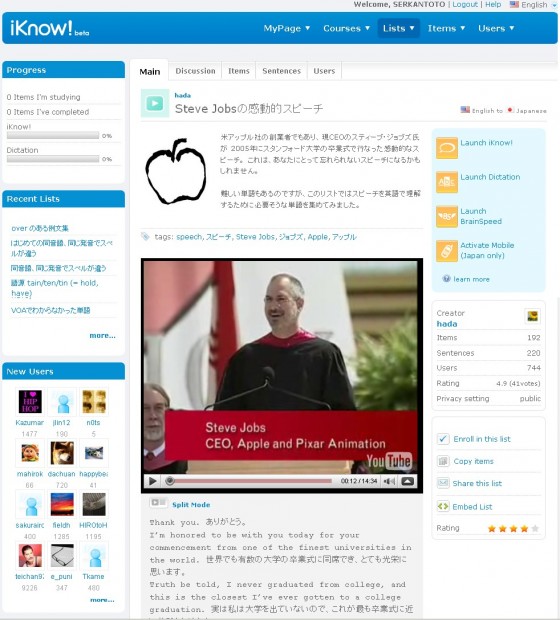 The free site’s key element is the social network functionality, combined with extensive video, image, audio and gaming content. iKnow users are supposed to not only study on the site but also to accelerate the learning process by creating content and sharing this content with others. In this example, a user uploaded a YouTube clip of the first presidential debate between Barack Obama and John McCain and extracted key items and sentences himself. Here Steve Jobs teaches Japanese people English via a similarly processed video. Other users can now systematically learn these items in a structured lesson the system semi-automatically creates based on the user-generated content.