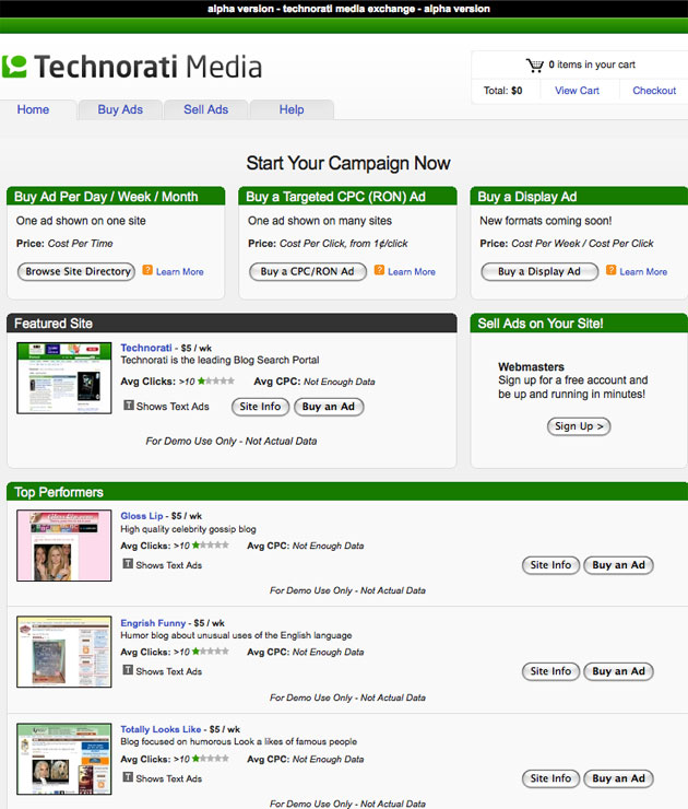 AdEngage, which was founded in 2004, sells advertising for 4,000 sites, and has 13 billion ad impressions per month, says Technorati CEO Richard Jalichandra. Many of those sites are adult oriented, so Technorati isn’t merging it with its core service. Instead, they’ll launch a separate version of it under the Technorati Media brand in a few weeks. The screen shot below shows what the current, password protected version of the site looks like.