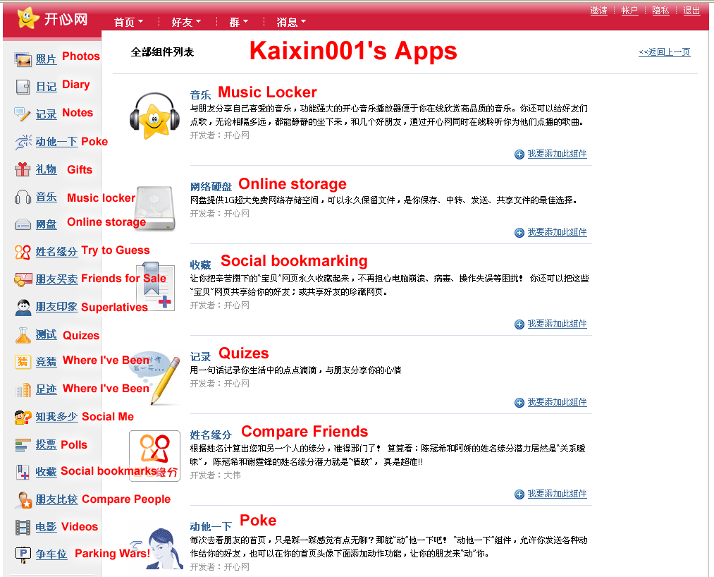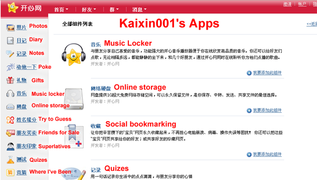 The 700 third-party applications on Xiaonei have a huge variability in quality. Kaixin001 has only 25 applications, yet it retains complete control over quality and and has the speed and focus needed to bring well-tuned viral hits to the Chinese market faster than its competitors—perhaps the better strategy in hindsight.