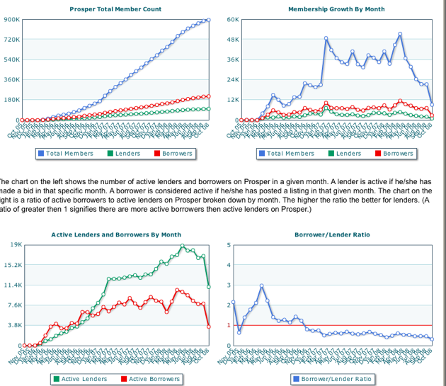 You can see on Lending Stats that Prosper”s membership growth and the number of active lenders and borrowers took a dive starting last April. And delinquencies for loans more than 18 months old are trending at higher than 30 percent. That is because a large portion of Prosper’s loans are in the sub-prime category. People who couldn’t borrow from a bank, borrowed from their neighbors on Prosper instead.