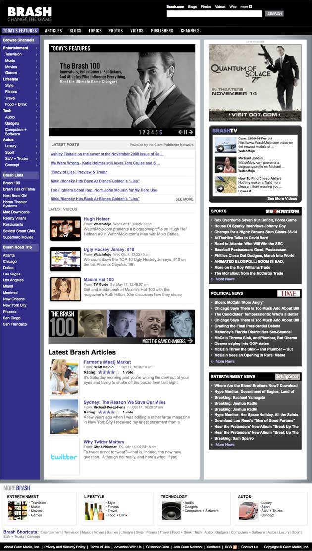 Launch advertisers include Unilever’s Axe brand deodorant, H&M and HP. The new James Bond Movie “Quantum of Solace” is one of the top new advertisers on Brash as well. Glam says that the aggregated Comscore user numbers from the original content partners is over 10 million/month.