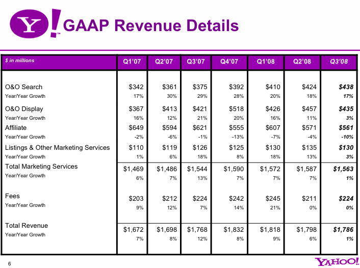 Yahoo just announced third quarter earnings. Revenues were flat, up one percent to $1.79 billion. The company met consensus earnings estimates of $0.09 a share. CEO Jerry Yang on the conference call says that yahoo will lay off “at least 10 percent by year end.” That’s 1,500 people, as expected. (Yahoo ended the quarter with 15,200 employees). And that might not be all. He calls he headcount reduction a “first step” and that “additional structural changes” may be taken in 2009 and beyond.