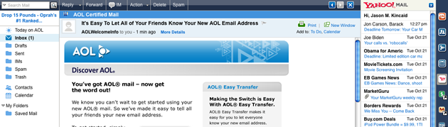 The move is another step in AOL’s attempt to prove that it is no longer a walled garden. Unfortunately Yahoo’s API handicaps how useful the feature is, as its integration is pretty clunky – instead of pulling in your messages and displaying them in AOL’s webmail interface, each message is actually a link to the Yahoo webmail client that opens in a new browser window.