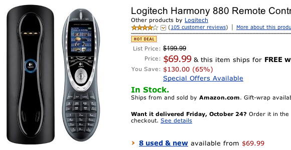 Disclaimer: it’s a refurb, but still a hell of a price for a great remote. Remotes like these Harmony’s are must-haves if you use multiple AV components. They consolidate everything into one, very easy to use package that’s programmed on your computer making controlling your entire AV system a breeze. It’s too bad that the 880 sends out only IR signals and not RF, otherwise I would pick one up to replace my dead remote.