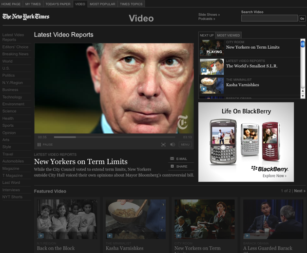 Previously, the NYTimes was using the FeedRoom as its main video platform. (This swap doesn’t come out of the blue. The New York Times is an investor in Brightcove). I know of at least one more large video site that is going to announce it is switching to BrightCove 3 next week (more on that later). In the case of the NYTimes.com, one of the things Briightcove 3 will allow it to do is eventually stream HD-quality video and distribute that video elsewhere. As of now, the video is closer to DVD-quality at 1.5 megabits per second, but the site has standardized around the 16:9 landscape aspect ratio most HD video is shot in. (Brightcove 3 dynamically adjusts the resolution of the video stream to whatever the viewer can handle based on player size and bandwidth).